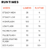 8 Licht Modis wählbar, einschliesslich garantierter Laufzeiten von bis zu 50 Stunden